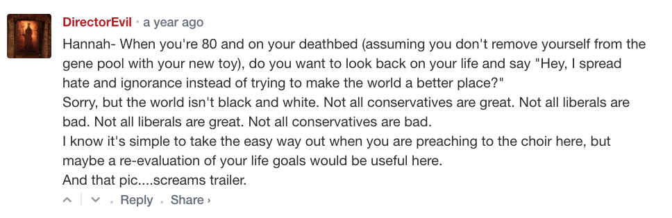 HAHAHAHA. My pic screams trailer. Also, I’m pleased to let DirectorEvil know that my gun has been on its best behavior for the last year and a half. It hasn’t injured me or anyone else.