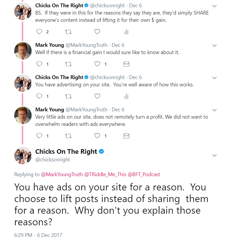 I’m not sure how this changed into a conversation about sexual misconduct, but we’re not suggesting that Mark and Chuck are anything like Al Franken or John Conyers. I’ve no reason to believe they’re anything but lovely to women in their interactions with them. But that’s not the issue. The issue is how they take other people’s work without permission, and post it as their own.
