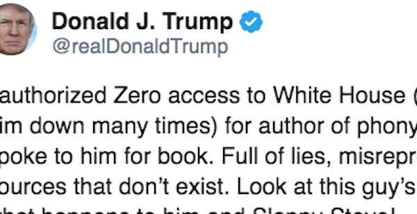 I authorized Zero access to White House (actually turned him down many times) for author of phony book! I never spoke to him for book. Full of lies, misrepresentations and sources that don’t exist. Look at this guy’s past and watch what happens to him and Sloppy Steve!