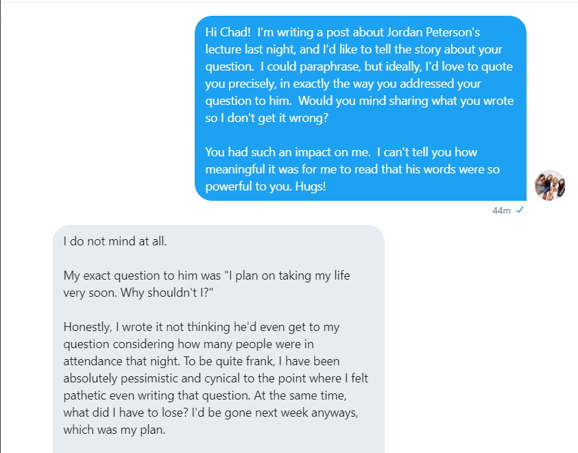 All in all, the evening was one I won’t forget. And I woke up in the morning with the question from the person considering suicide heavy on my mind. Something compelled me to look at Dr. Peterson’s twitter feed, where I saw this: