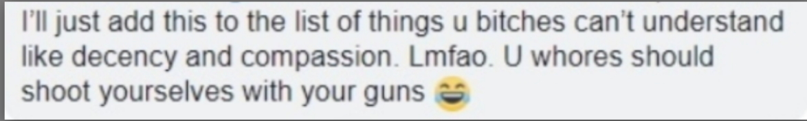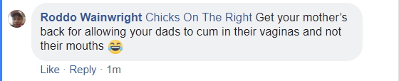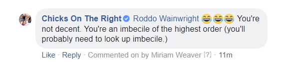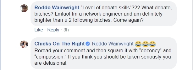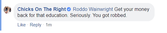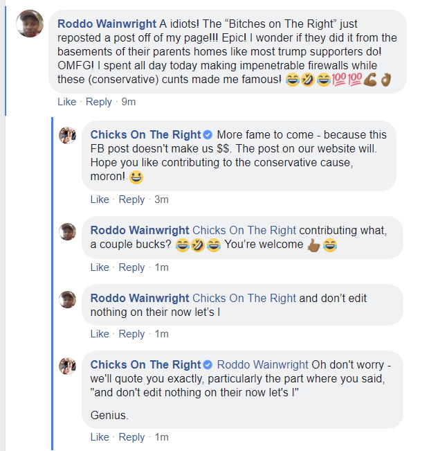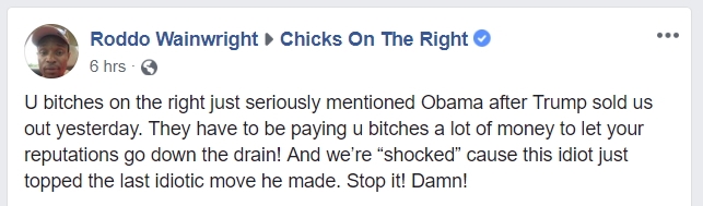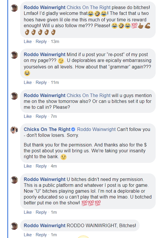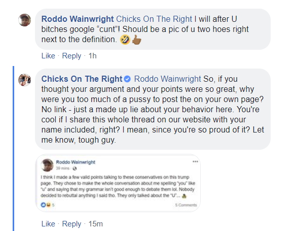 Amazing, isn’t it? That he chose not to link to his post or make reference to what Facebook page he commented on? I love how he’s all, “nobody decided to rebuttal anything I said.” DUDE. The verb you’re looking for is “rebut” and the reason no one offered you a rebuttal is because nothing you said was remotely coherent. Plenty of our followers offered really well thought-out, specific and helpful ideas to Roddo about how he could #walkaway from the plantation he’s clearly on, but Roddo wasn’t having any of that. Because, you know, he was very busy calling us bitches and whores and whatnot.