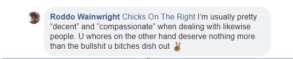 I am still laughing about how Roddo is trying to lecture us about understanding “decency and compassion” in the SAME COMMENT that he’s calling us bitches and whores in. PRICELESS.