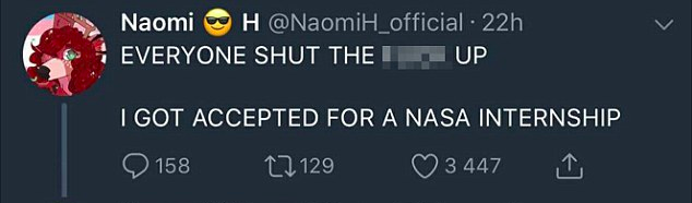 ‘I learned she had lost her offer for an internship with NASA,’ he wrote in a post on his website Tuesday.