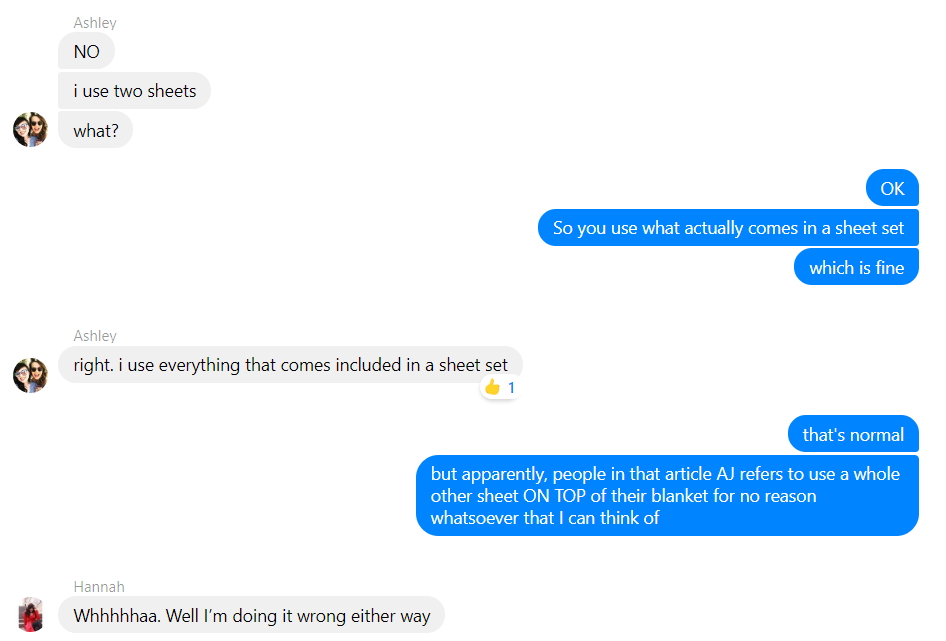 But it turns out, Hannah DOESN’T USE ANYTHING BUT THE FITTED SHEET. And this is what I now think the article was talking about, in which case I agree with Daisy that we’re all basically doomed.