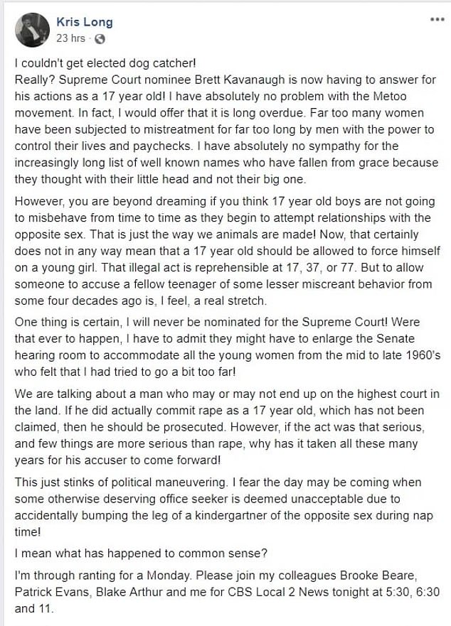 A California news anchor (he worked for the CBS affiliate KESQ-TV in Palm Springs) had to resign after posting the following pro-Kavanaugh spiel.