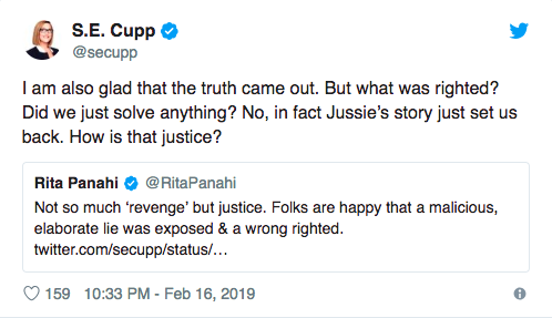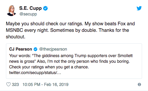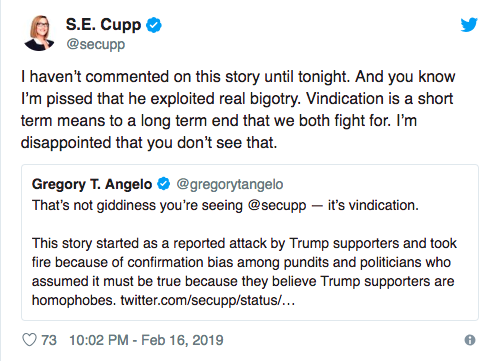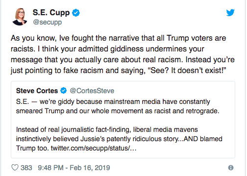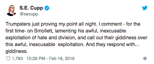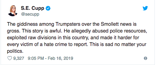 Well…S.E. Cupp managed to one-up this. She doesn’t just not think Trump supporters deserve an apology…