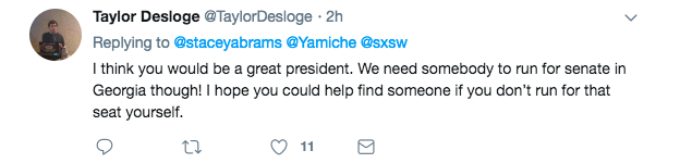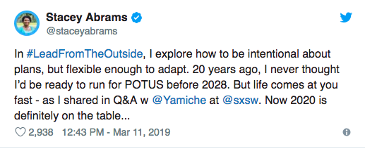Abrams’ comment came after an interview at the South by Southwest conference in Texas, where Abrams reportedly said she previously thought 2028 would be the earliest she could run for president, but over Twitter, she clarified: “Now 2020 is definitely on the table.”