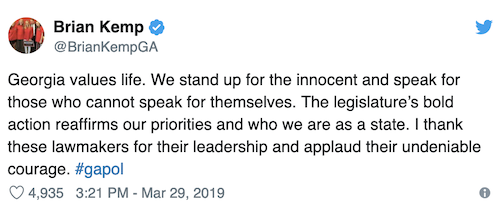 Georgia’s House has passed the “heartbeat bill” 92–78, meaning that it’s now headed to Gov. Brian Kemp’s desk. He said he would sign it.