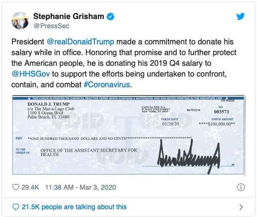 President Donald Trump donated his fourth-quarter salary to the Department of Health and Human Services on Tuesday to help fight coronavirus.