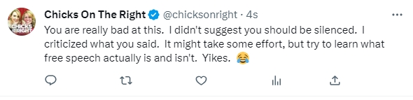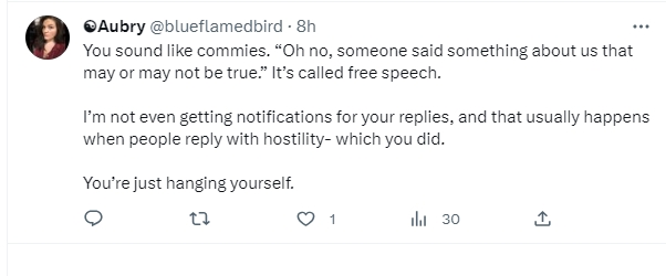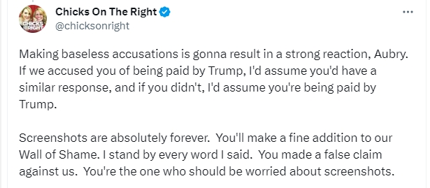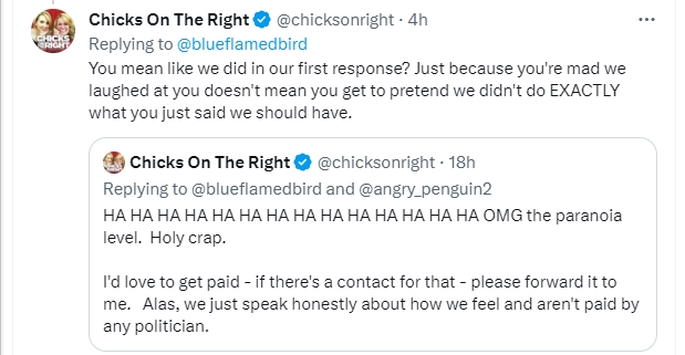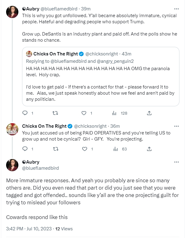 But this Aubry chick seems to be under the impression that any “RW influencer” (which she categorizes us as), cannot possibly support DeSantis without being PAID by him. And who knows? Perhaps he’s paying some folks out there. Trump paid Diamond and Silk, and probably others, so why this is bothering her, I have no idea. But it’s simply not accurate when it comes to us, and it’s hilariously paranoid, and just utterly ridiculous. Which is why I responded the way I did.