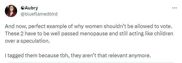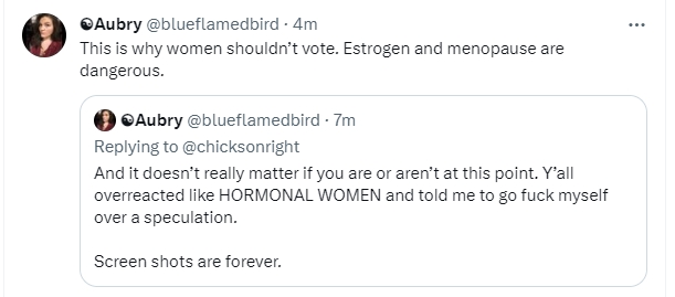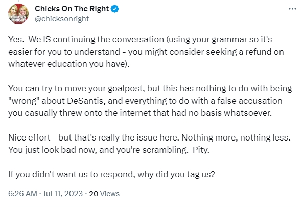 So let’s just get a running tally here, shall we? We’re being paid by DeSantis, we’re cowards for correcting the record, we’re immature because we’re responding strongly, we’re HORMONAL because we’re not being doormats in the face of lies, and women shouldn’t vote. Wow. There’s a lot going on there.