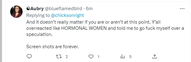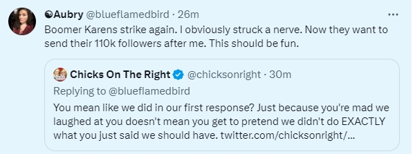 Anyway, here’s how things went down. Apologies to those of you who don’t like cursing, but I was feeling pretty feisty yesterday. It all started when some Aubry chick randomly tagged us in a conversation, so it showed up in my mentions, ostensibly because she was looking for a response or comment from us. After all, that’s how Twitter works.